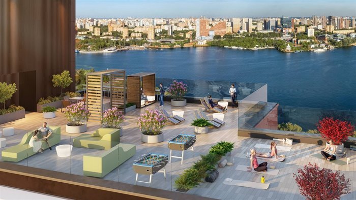 На крыше расположилась открытая терраса для резидентов жилого комплекса. Здесь вы сможете отдохнуть, поработать или заняться спортом.