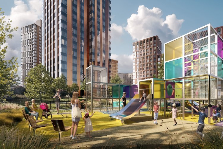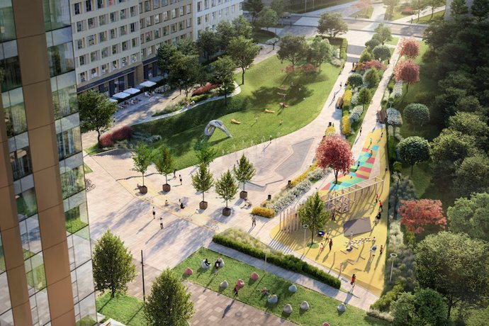 На закрытой охраняемой территории разместятся подземные паркинги, зоны для отдыха, дорожки для бега, спортивные площадки и зеленые зоны общей площадью 19,5 га. Жители смогут прогуливаться в центральном парке и по благоустроенной набережной Москвы-реки